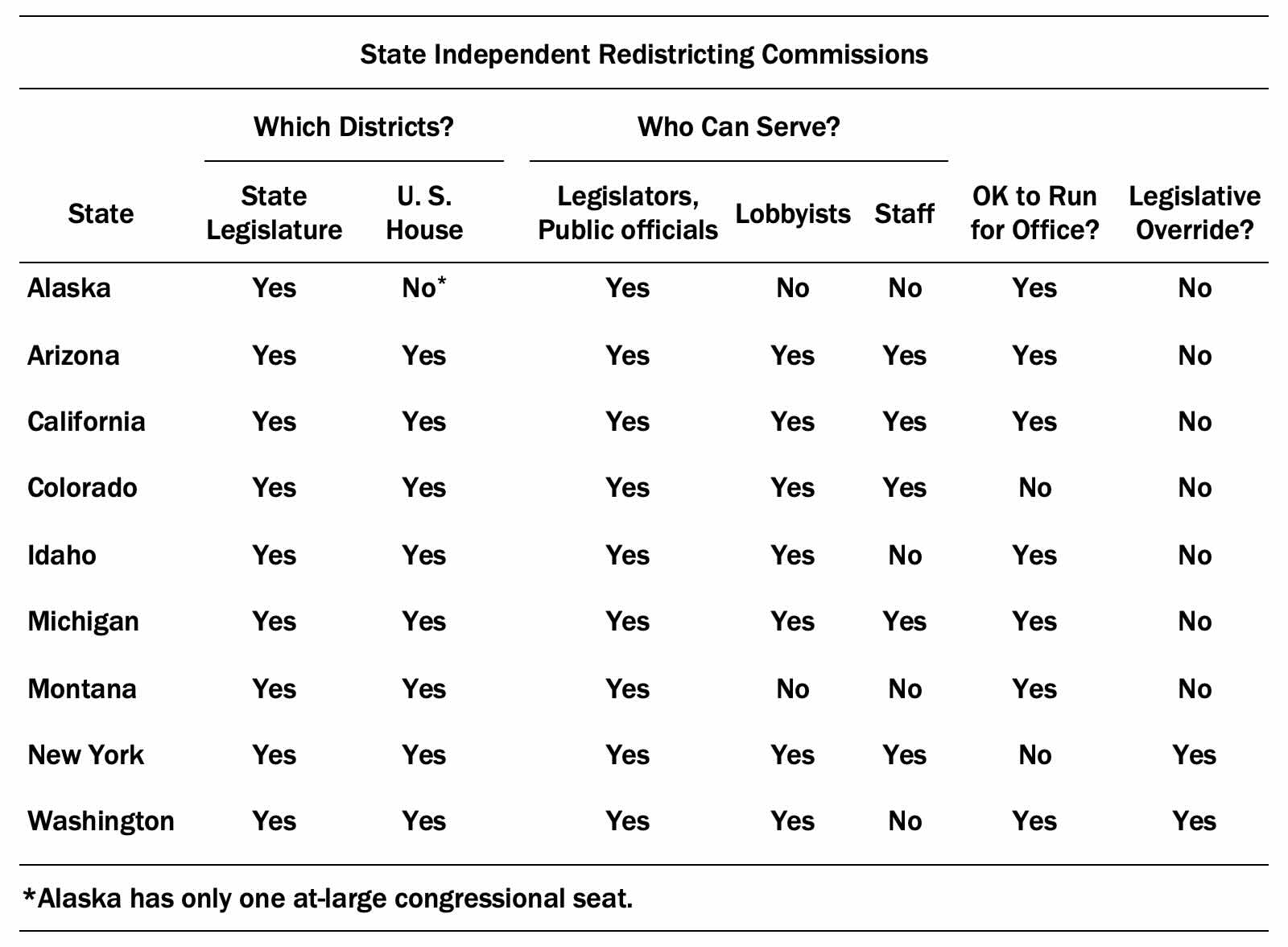 As of 2025, nine states (Alaska, Arizona, California, Colorado, Idaho, Michigan, Montana, New York, and Washington) use independent commissions to draw congressional and state districts. Members of these commissions cannot be legislators or public officials. Many states go further, barring commissioners from running for office, working as lobbyists, or serving as legislative staff.