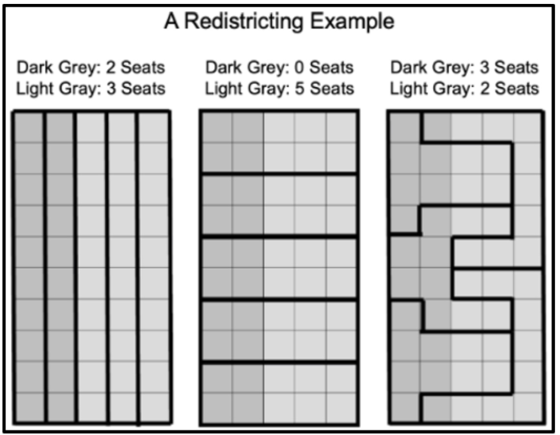 Imagine a state where 60% of voters belong to one party (light gray) and 40% to the other (dark gray). The state elects five representatives: